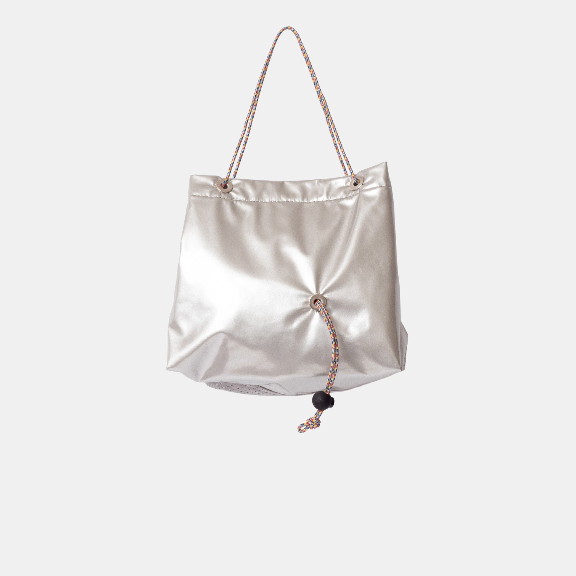 ・手提げ、ひじ掛け、コードを一方に寄せると、巾着型の肩掛けにも。コードの結び目を調節することでも、自由に長さも変えられます。