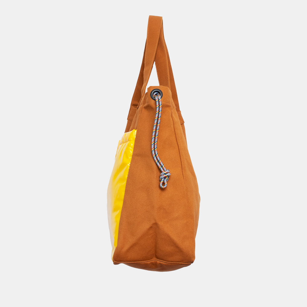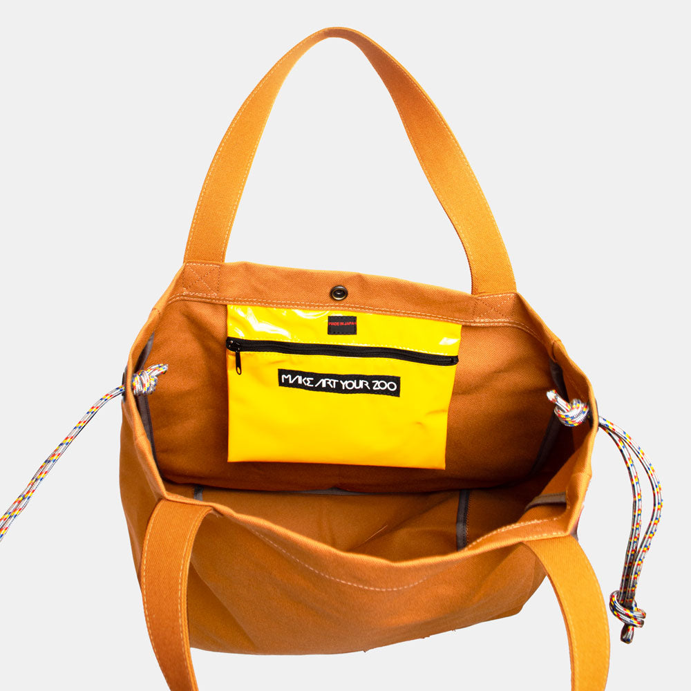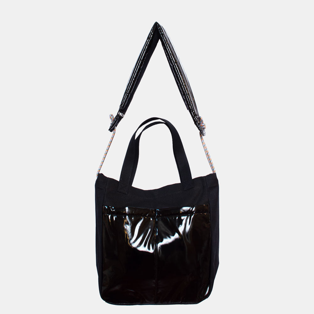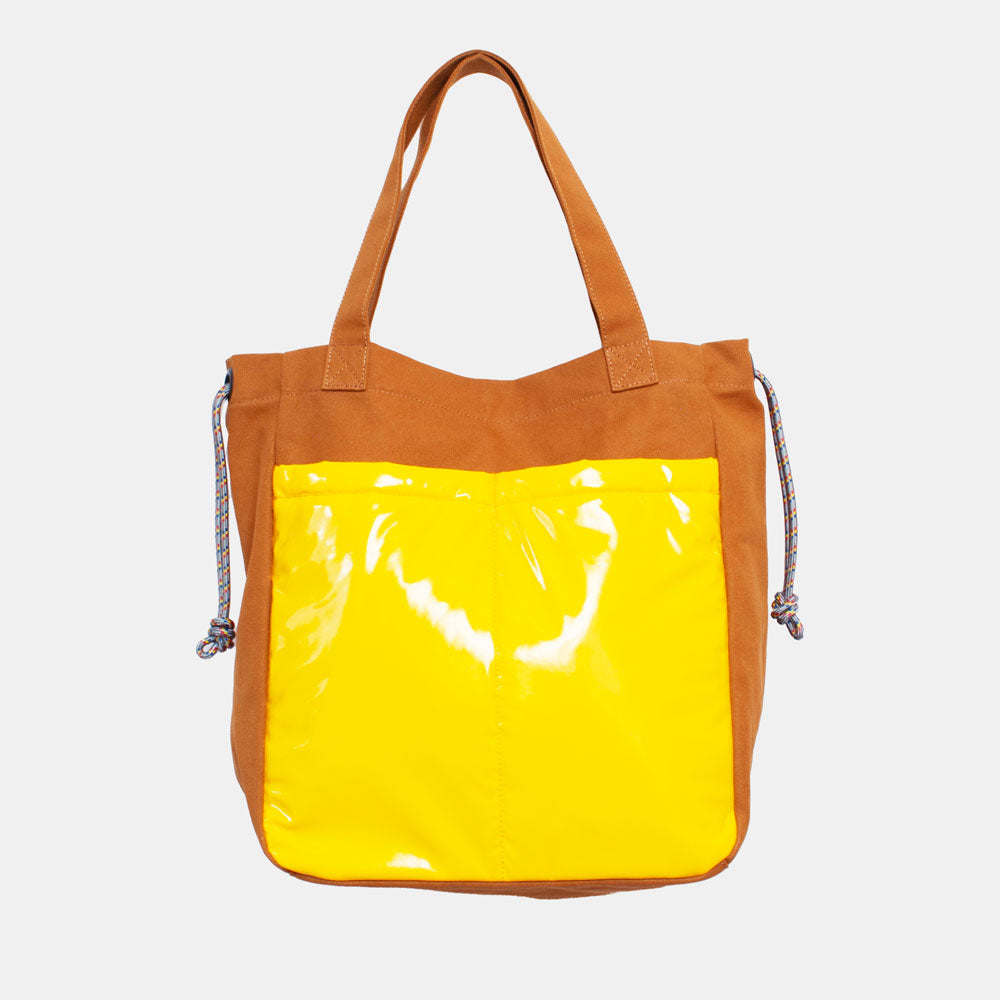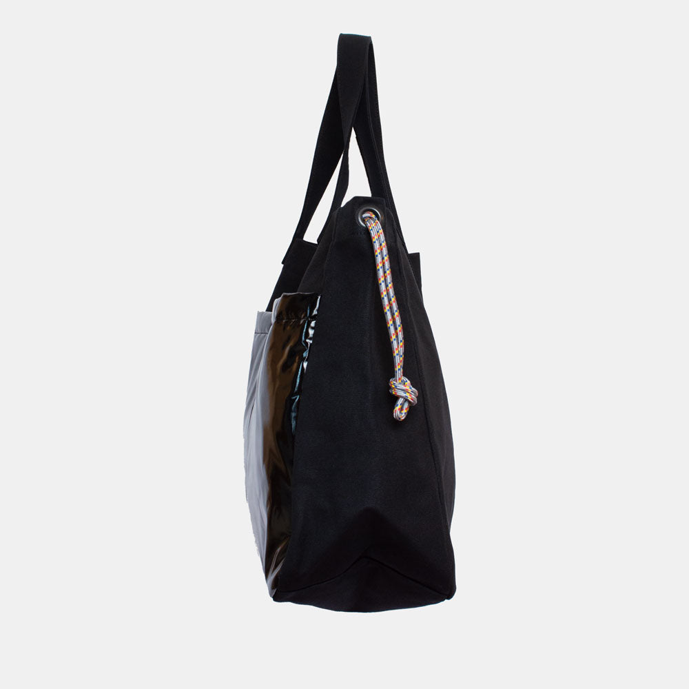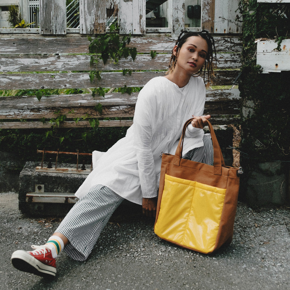 ハリのある帆布とエナメル調の大きな外ポケットの組み合わせがトレードマークの、大容量トートバッグです。