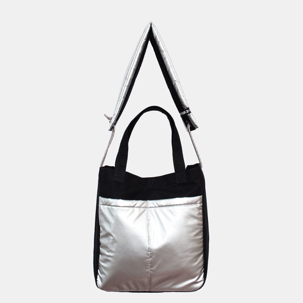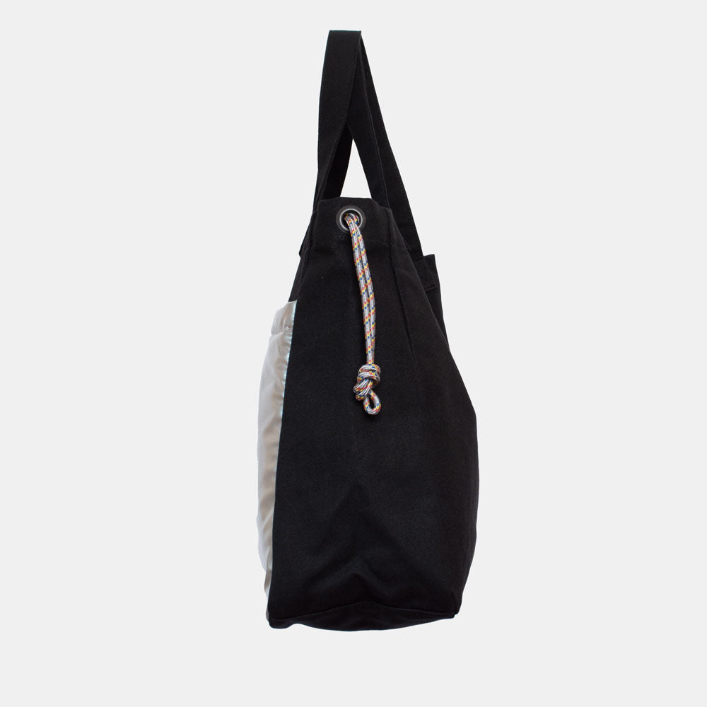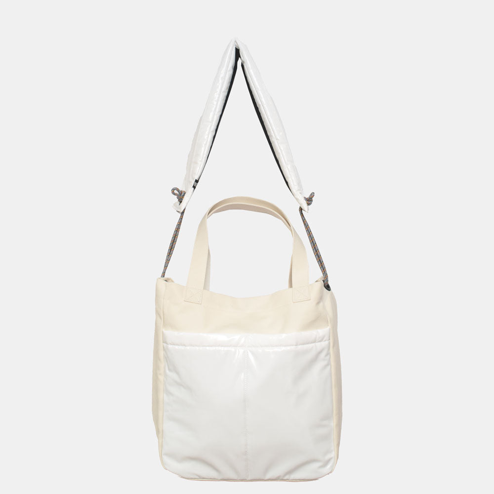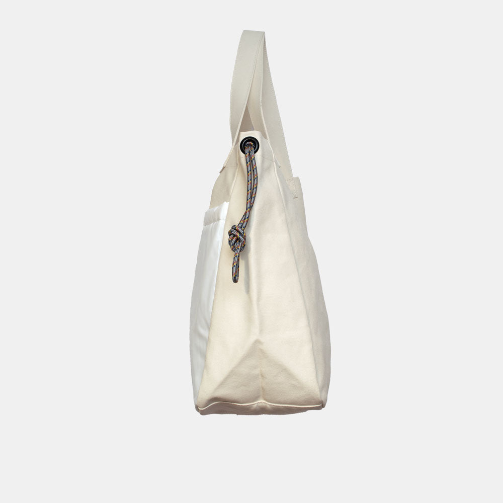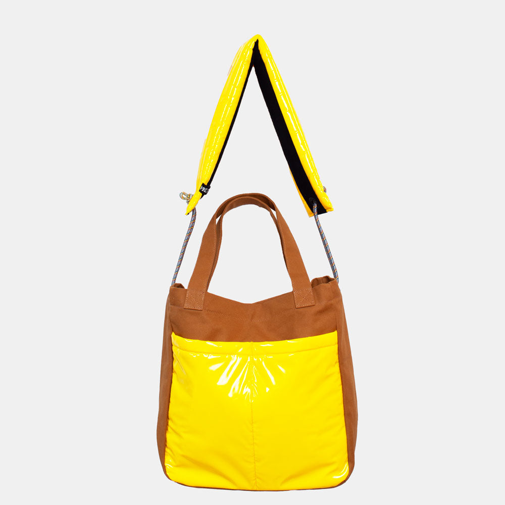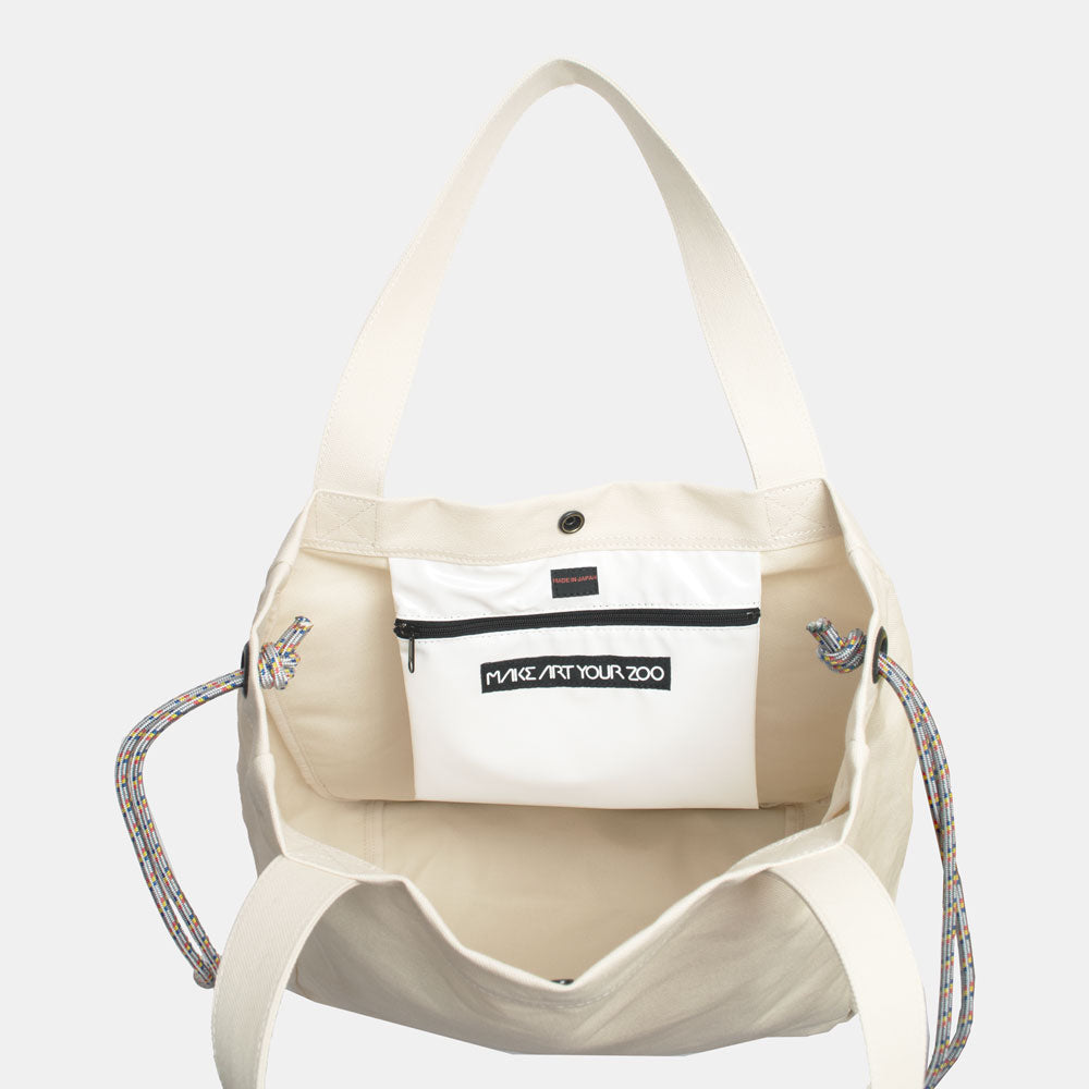 ハリのある帆布とエナメル調の大きな外ポケットの組み合わせがトレードマークの、大容量トートバッグです。